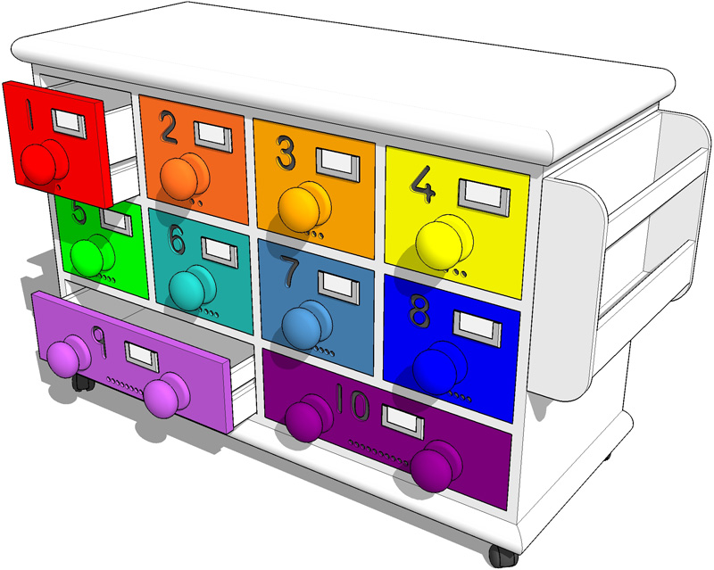 Proposed design for a chest of drawers as part of a range of children's nursery furniture.